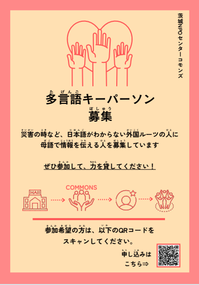 また、この訓練と合わせ、コモンズでは災害時に避難情報などを外国籍住民に届ける方法としてあらかじめ登録した各言語のキーパーソンを通じて災害に関する情報を各言語のコミュニティに流す取り組みも行っています。